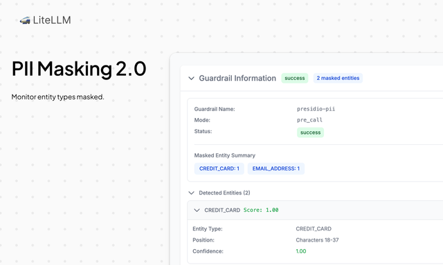 - Monitor guardrails in production. LiteLLM Logs will now show you the guardrail run, the entities it detected, and its confidence score for each entity.